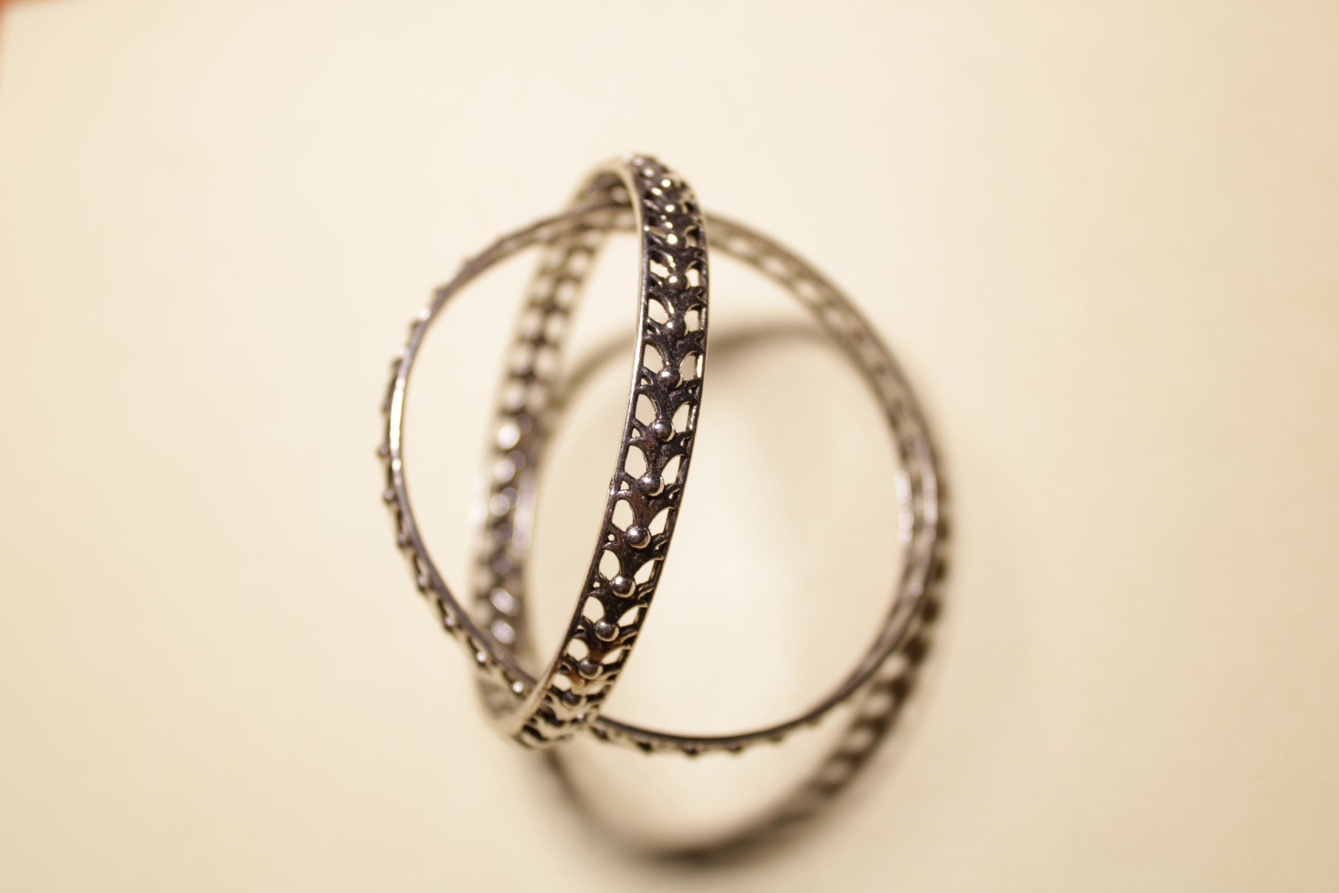 A refined pair of silver bangles featuring delicate cutwork detailing inspired by traditional patterns. The repeating openwork motif adds lightness and visual rhythm, giving the bangles an elegant yet timeless appeal.