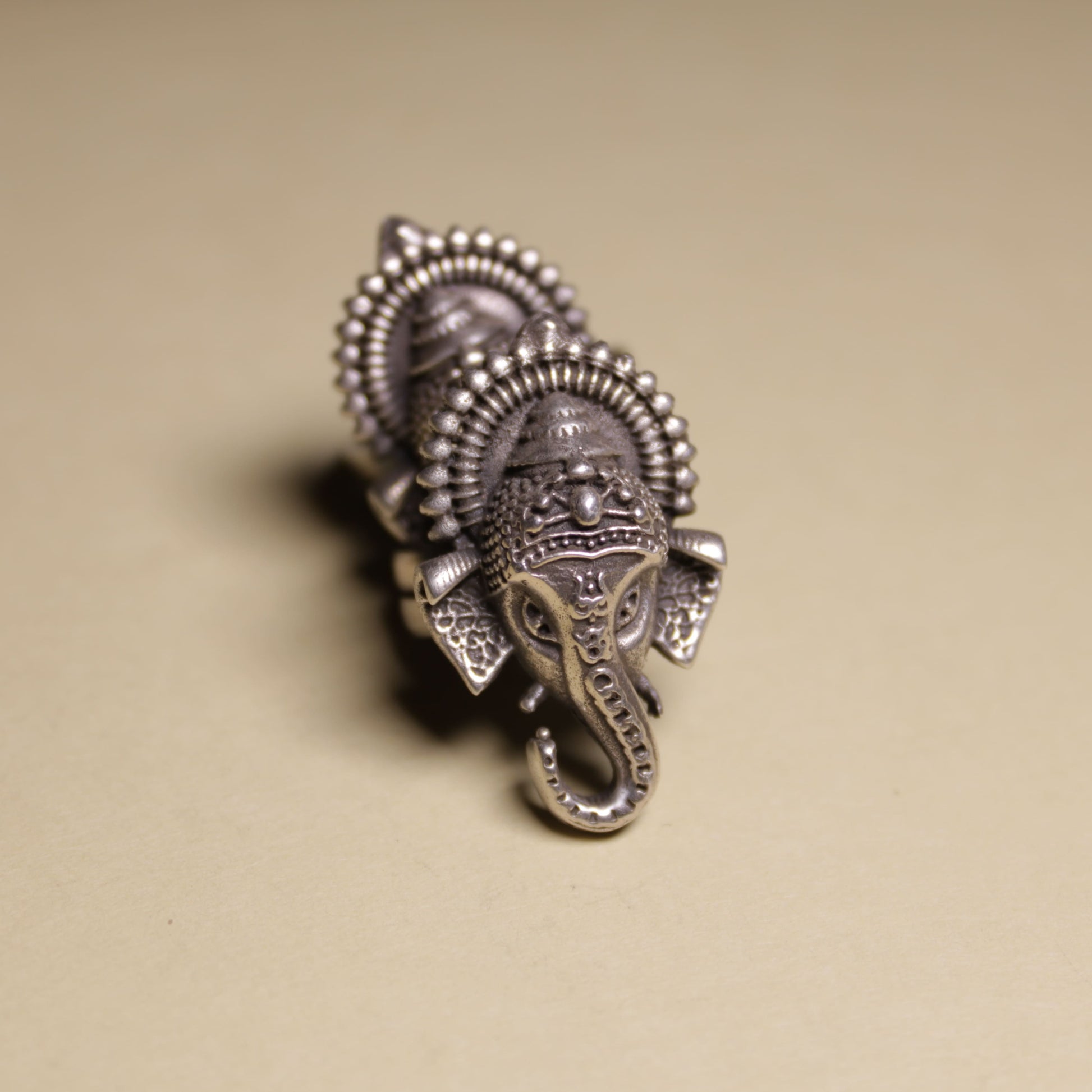 A striking statement ring featuring a finely sculpted depiction of Lord Ganesha, symbolising wisdom, protection, and new beginnings. The detailed facial features and ornamental crown give the ring a powerful spiritual presence with traditional artistry.