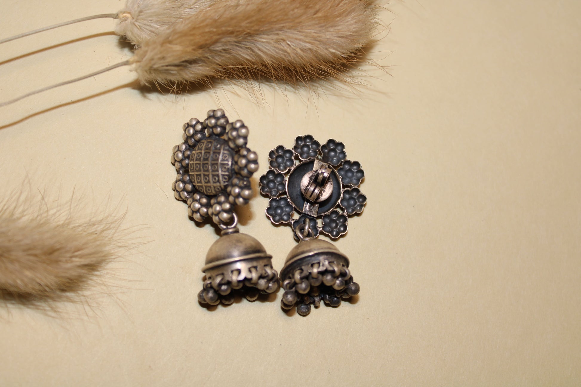 Classic jhumka earrings featuring a floral-inspired stud with a grid-textured centre, framed by clustered silver bead detailing. Finished with a traditional dome-shaped jhumka and delicate hanging links, the design reflects timeless Indian craftsmanship with a balanced, symmetrical form.