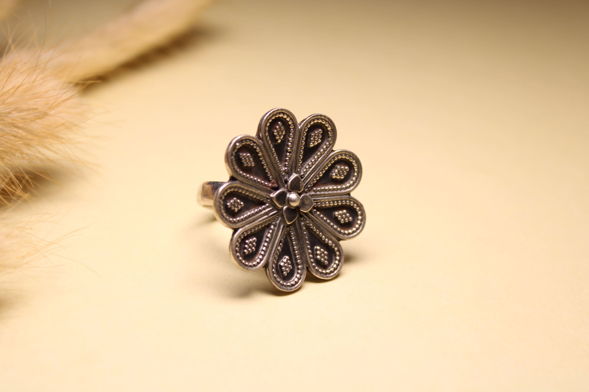 A bold hallmarked silver ring featuring a symmetrical floral motif with finely detailed petal patterns and delicate bead accents. The layered craftsmanship reflects traditional artistry with a timeless, elegant appeal.