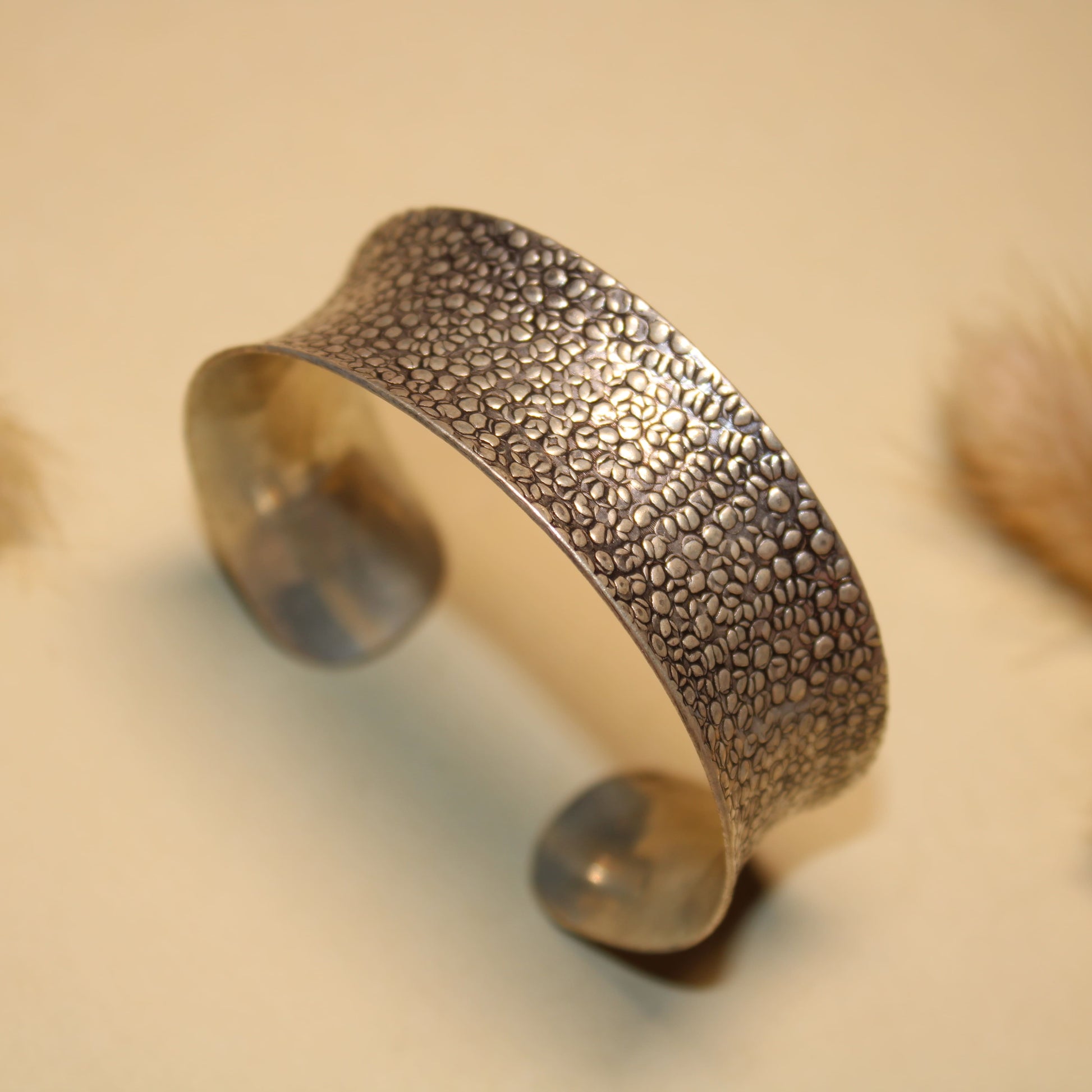 A contemporary open-ended silver kada featuring an all-over pebble-textured surface. The organically raised pattern creates a bold, tactile look while maintaining a clean, balanced silhouette that feels modern yet timeless.