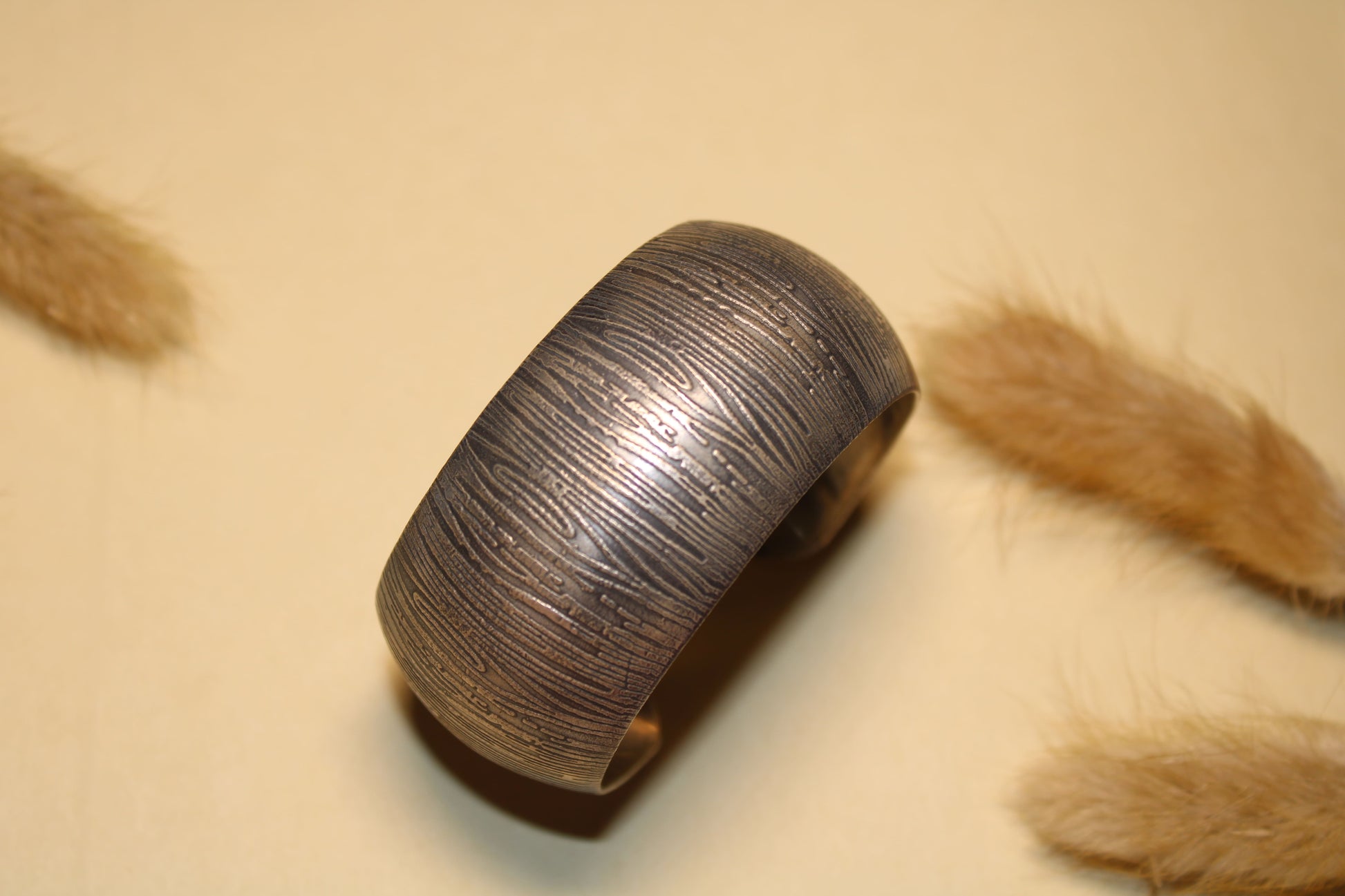 A bold open-ended silver kada featuring a wide band with finely etched linear textures. The curved silhouette and oxidised finish give it a contemporary yet handcrafted appeal, making it a strong statement piece.
